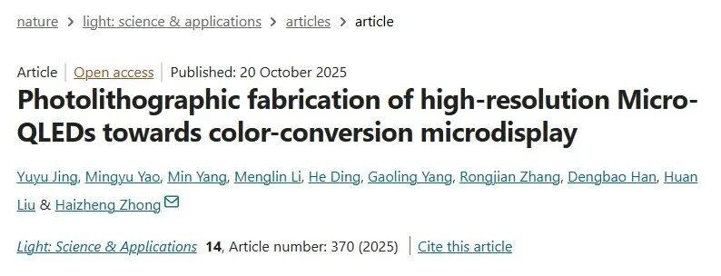 10月20日,一项发表于国际顶尖光学期刊Light: Science & Applications的研究成果,Photolithographic fabrication of high-resolution Micro-QLEDs towards color-conversion Microdisplay,为下一代增强现实(AR)与虚拟现实(VR)设备的显示技术带来了突破性进展。由北京理工大学钟海政教授团队领衔,联合多家科研单位,成功开发出基于光刻工艺的高分辨率全彩色量子点发光二极管(Micro-QLED)微显示屏。该研究不仅实现了目前同类器件中最高的像素密度,还展示出优异的发光效率与亮度,为微显示技术的低成本、大规模制造提供了全新路径。