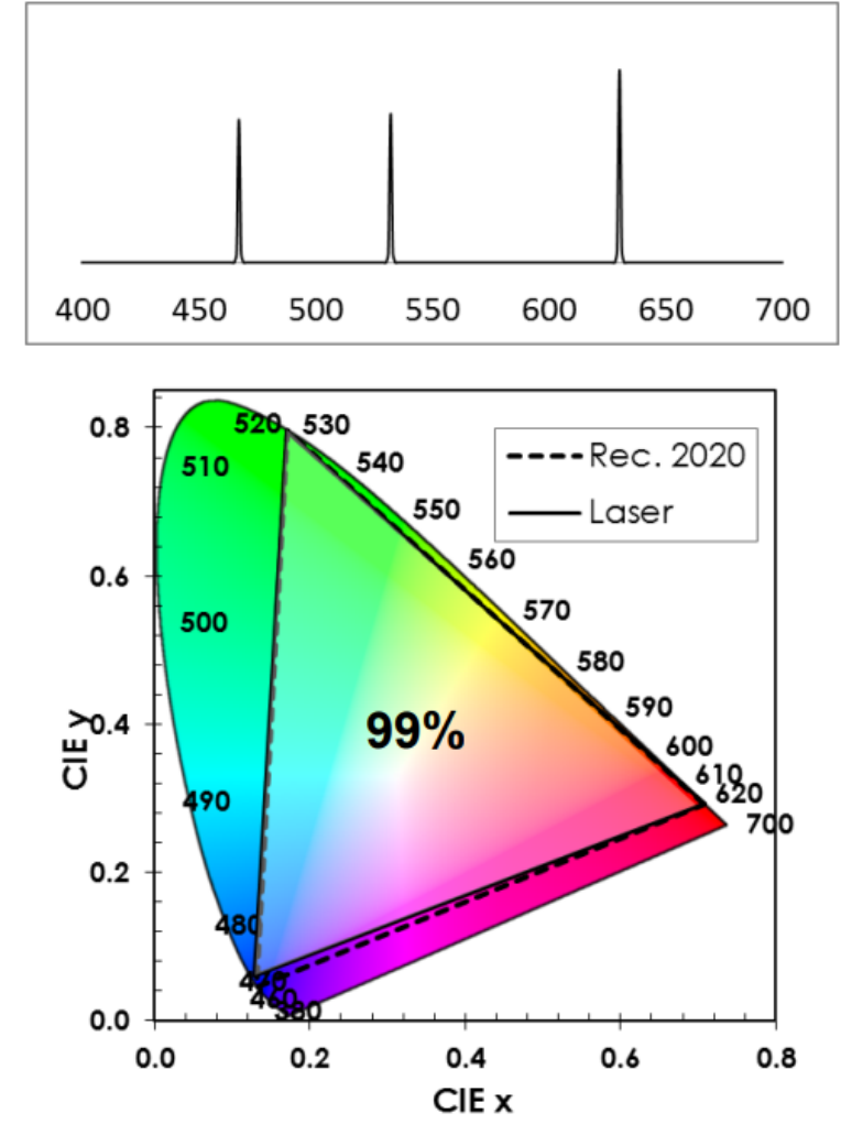 激光的光谱带宽很窄,这意味着颜色更加纯净,通过RGB三色合光,能够覆盖更加宽广的色域。例如激光显示覆盖的色域接近甚至超过BT.2020标准(>90%),而普通LCD通常只能覆盖sRGB或部分P3。