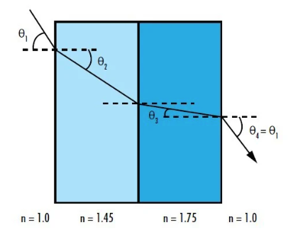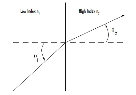 根据涅尔折射定律:n1sinθ1=n2sinθ2(n1 是入射媒介的折射率,θ1 是入射光线的角度,n2 是折射/反 射介质的指数,θ2 是折射/反射光线的角度)