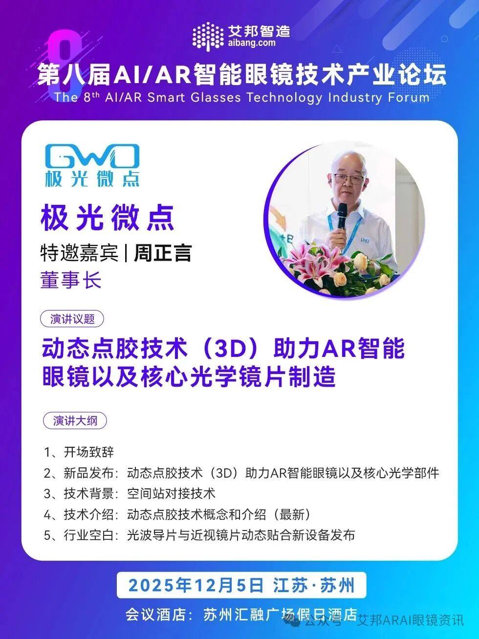 12月5日,由艾邦主办的“第八届AI/AR智能眼镜技术产业论坛”将在苏州召开。届时,极光微点 董事长 周正言博士 将带来《动态点胶技术(3D)助力AR智能眼镜以及核心光学镜片制造》相关演讲分享,欢迎产业链同行莅临现场,共同交流!