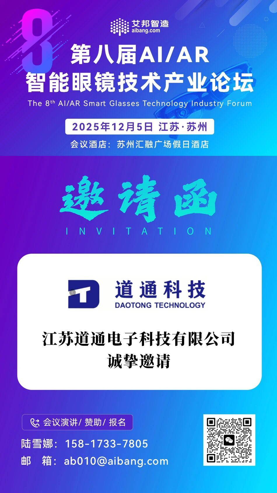 12月5日,江苏道通电子将在第八届AI/AR智能眼镜技术产业论坛上做展台展示,届时将展示AR眼镜数据线束产品。