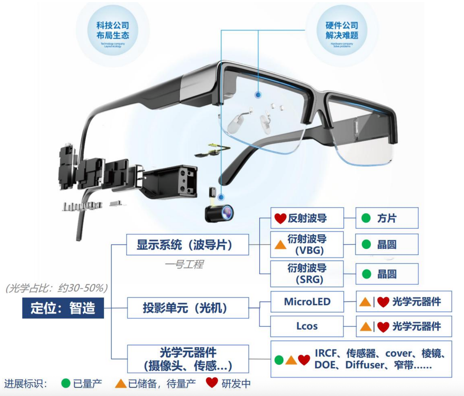已发布使用阵列光波导的智能眼镜产品:Meta Ray-BanDisplay(阵列光波导二维扩瞳技术)、INMO Air2(Mirco-OLED+阵列光波导全彩双目)、谷东科技 Star1S(全彩双目阵列光波导)、灵犀微光 L2-S30等。
