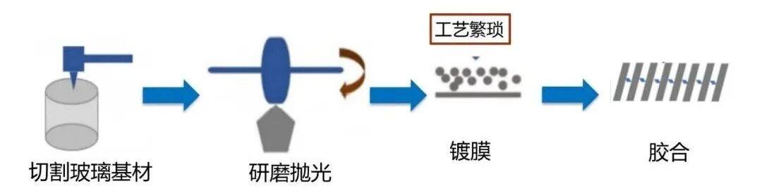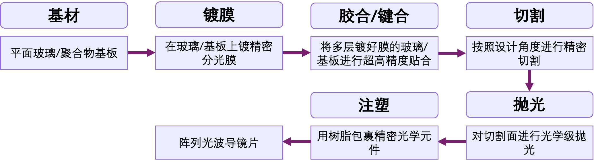 阵列光波导基于传统几何光学原理,大部分工艺为较为成熟的冷加工工艺,设计原理相对简单,不涉及纳米级结构,主要分为镀膜——胶合/键合——切割/研磨——注塑——检测等流程。