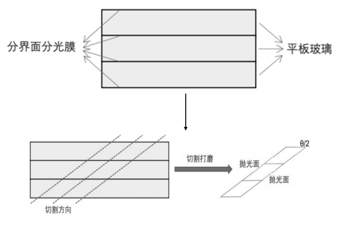 半透半反射镜是阵列光波导中光线传输的重要组件,将多个平行排列的镜面嵌入玻璃基底中,并与传输的光线形成一个特定的角度,每一个镜面会将部分光线反射出波导进入人眼,剩下的光线透射过去继续在波导中前进,然后又会遇到另一个半透半反射镜面,重复以上过程,直到经过阵列中的最后一个镜面将全部的光线都反射出波导,进入人眼。