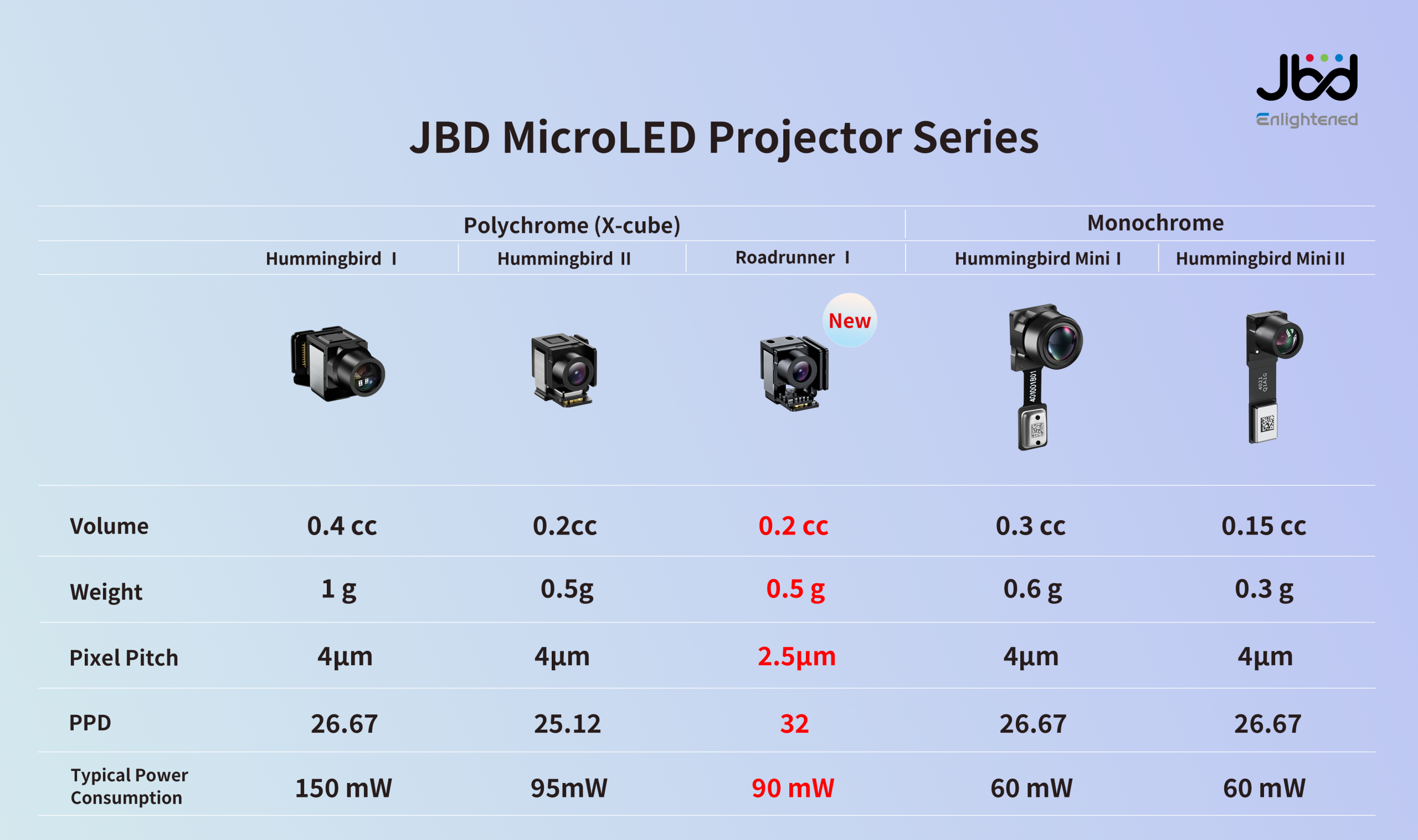随着“走鹃Ⅰ”的发布,JBD已构建起清晰的MicroLED光引擎产品矩阵:“蜂鸟”系列专注于轻量化主流市场,持续推动消费级AR设备的普及;全新“走鹃”系列则聚焦极致视觉,以超紧凑体积、更高角分辨率、更大视场角树立显示性能新标杆。两大系列协同,为AR/AI智能终端产业注入强劲动能。