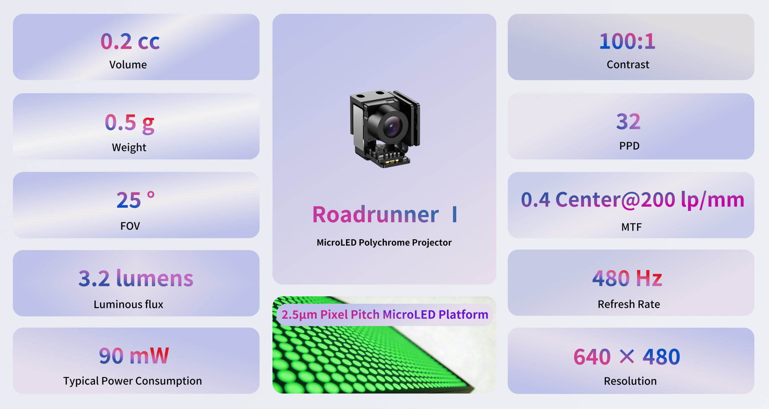 与LCoS等传统AR光引擎相比,“走鹃Ⅰ”在像素尺寸、体积、重量、对比度、刷新率及典型功耗等关键指标上实现了超越,成为打造轻量级全彩AR智能眼镜的首选显示方案。目前,“走鹃Ⅰ”彩色光引擎已正式开放送样。