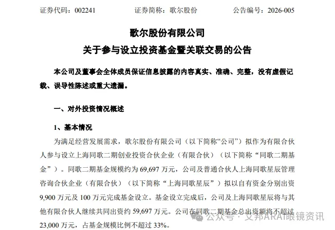 1月10日,歌尔股份发布公告,披露了公司在投资领域的最新布局。公告显示,为满足经营发展需求,歌尔股份拟作为有限合伙人参与设立上海同歌二期创业投资合伙企业(有限合伙)(简称“同歌二期基金”)。该基金总规模约为6.97亿元人民币,其中歌尔股份拟以自有资金出资不超过2.3亿元,占基金规模比例不超过33%。 根据合伙协议,同歌二期基金的存续期为7年,其中前4年为投资期,后续为退出期。基金主要投资领域聚焦于科技前沿,包括人工智能、XR与空间计算、新材料与先进制造、立体出行以及半导体等方向。 歌尔股份表示,此次投资旨在借助专业投资机构的管理能力与资源优势,拓宽投资渠道,把握市场机遇并分享行业发展成果。同时,该基金不纳入公司合并报表范围,投资事项预计不会对公司经营产生不利影响。 在歌尔股份通过设立基金寻求财务投资与产业协同的同时,其在实业并购层面也有新动作。 1月9日,天眼查工商信息披露,舜宇奥来微纳光学(上海)有限公司发生工商变更。原股东舜宇光学旗下的宁波舜宇奥来技术有限公司、宁波舜奥自有资金投资合伙企业(有限合伙)以及宁波舜承自有资金投资合伙企业(有限合伙)悉数退出,新增歌尔光学科技有限公司为全资股东。 资料显示,舜宇奥来微纳光学(上海)有限公司成立于2022年12月,注册资本达7.73亿元人民币,经营范围涵盖光学仪器制造、光学玻璃制造及光学仪器销售等核心业务。 值得一提的是,此前舜宇奥来微纳光电信息技术(上海)有限公司也发生了类似的工商变更,原股东退出后同样由歌尔光学科技有限公司接手成为全资股东。 这一系列收购动作或显示出歌尔股份在光学微纳领域的深度整合意图,与其新设基金关注的XR与空间计算等投资方向形成了实业+资本的双轮驱动布局。 来源:LEDinside 艾邦建有AR/VR产业链微信群,目前有HTC、PICO、OPPO、亮亮视野、光粒科技、影创、创维、佳视、歌尔、立讯精密、多哚(纳立多)、欣旺达、耐德佳,联创电子、至格科技、灵犀微光、舜宇光学、广景视睿、珑璟光电、京东方、海信视像、科煦智能、阿科玛、金发科技、思立可、新安天玉、四方超轻、大族激光、发那科、承熹机电等加入,也欢迎大家长按下方图片识别二维码加入微信群: 资料下载: AR VR显示技术报告 2022年ARVR推出的新品总结20221103 2022年5月27日AR/VR产业链论坛演讲PPT AR 光波导显示方案企业介绍 国内45家AR/VR/MR头显品牌企业盘点 AR/VR/元宇宙ODM/OEM代工16强 AR/VR高分子材料供应商介绍20强 AR/VR材料介绍PPT 欢迎您点击此处加入AR/VR通讯录,目前已经有3000多人加入,如歌尔、HTC、OPPO、创维、PICO、字节跳动、黑鲨、联想、耐德佳、灵犀微光、立讯、领益智造、欧菲光、华勤、闻泰、立讯、珑璟光电、舜宇、深圳虚拟现实等,点击下方关键词可以筛选 品牌 代工 AR AR眼镜 VR ODM及方案 外观件 外观设计 内容 AR导航 游戏 交互 光学元件 智能终端 光波导 人脸识别 摄像头 眼动追踪 天线 软件 五金 语音识别 显示屏 光学镜头 塑胶件 文章导航 广纳四维C25C全彩波导首发亮相CES,助力合作伙伴斩获设计大奖