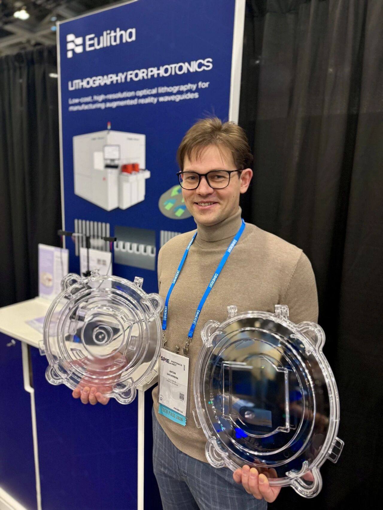 在 SPIE 2026 期间,先进光刻技术领导者 Eulitha 与 AR 衍射光波导制造商广纳四维(SEEV)联合展示关键工艺成果。基于 Eulitha 位移泰伯光刻(DTL)技术制备的广纳四维碳化硅刻蚀全彩样品亮相展会现场,标志着双方合作已将高性能 AR 光学器件的量产能力推至新高度。