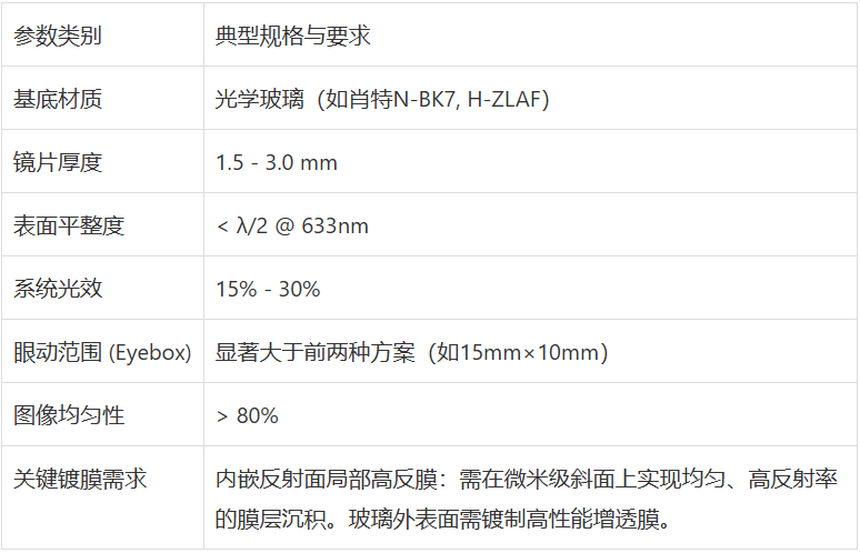 结构与命名解析:这是一片外观为平整的玻璃薄板。其核心技术在于玻璃内部通过精密加工形成的嵌入式反射面阵列。光线从耦合区进入波导,在一对平行的玻璃表面间发生全反射传播,并被内部的多个反射面阵列“接力式”地逐次耦出,扩展至更大的眼动范围(Eyebox)。