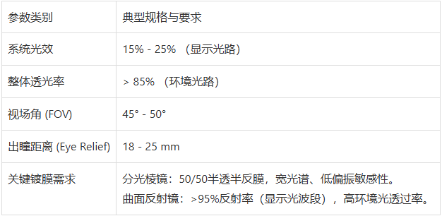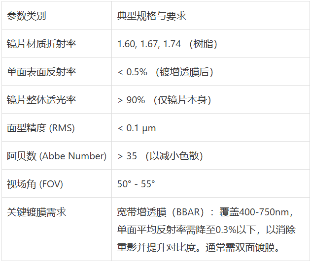 目前,市场主流的光学方案主要对应四大核心镜片类型:组合式棱镜镜片、自由曲面树脂镜片、阵列光波导平板镜片与衍射光波导镜片。每一种镜片都代表着独特的光学设计哲学、材料科学应用,并伴随着极其严苛的镀膜工艺要求,共同塑造了从消费级到专业级AR设备的视觉体验鸿沟。