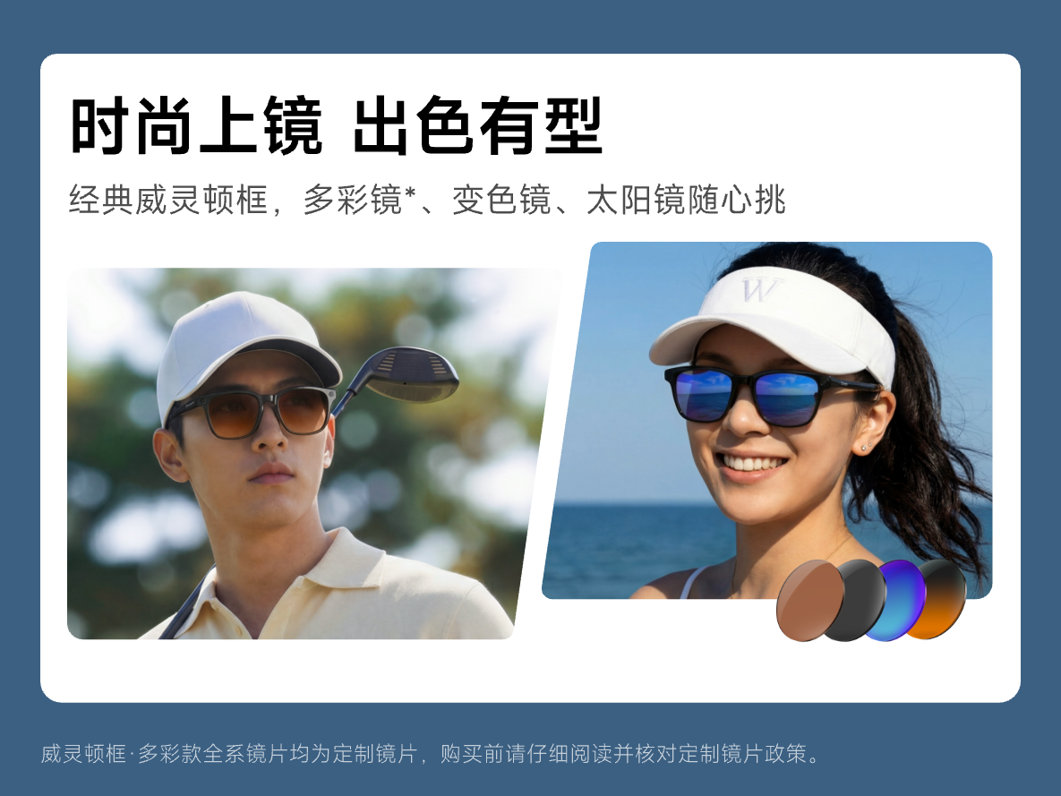 G1系列提供多场景专业镜片,除平光镜外,还有太阳镜智能变色镜,并提供7种可定制的多彩镜片,满足多种需求。