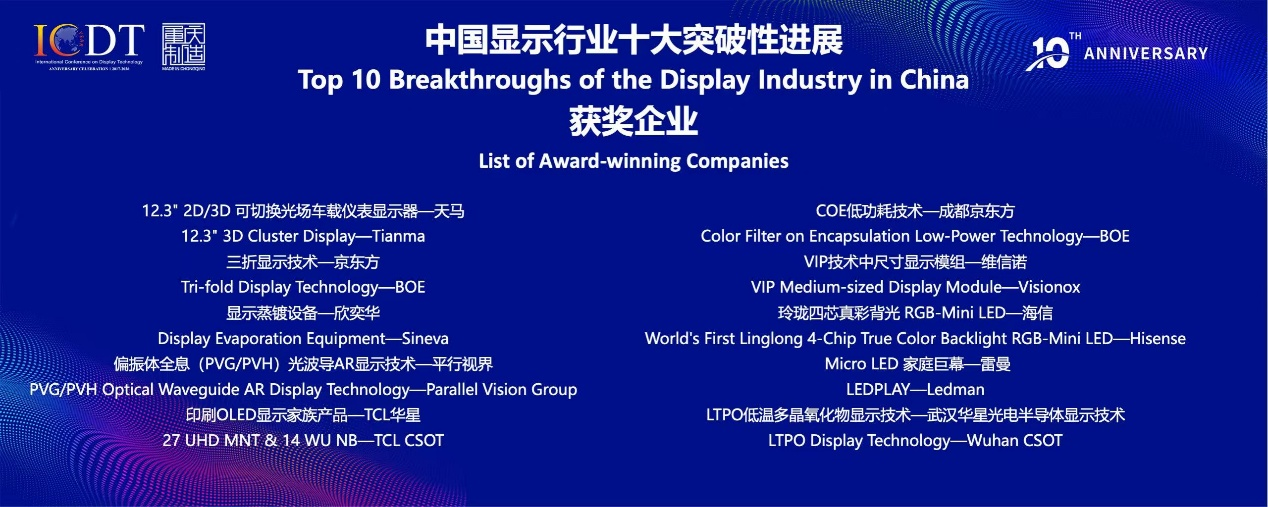 2026年是全球显示领域顶级盛会—国际显示技术大会ICDT创办十周年。为系统梳理过去十年(2016年1月1日-2026年1月1日)中国显示行业在技术研发、产业化及应用拓展等领域取得的重大突破,凝聚行业共识,记录发展脉络,国际信息显示学会(SID)在今年2月正式启动“中国显示行业过去十年十大突破性进展”评选活动,面向全行业公开征集提名。提名范围聚焦2016年1月1日至2026年1月1日十年间,在中国显示产业链上取得、并已产生显著行业影响的技术突破或产业化成果。