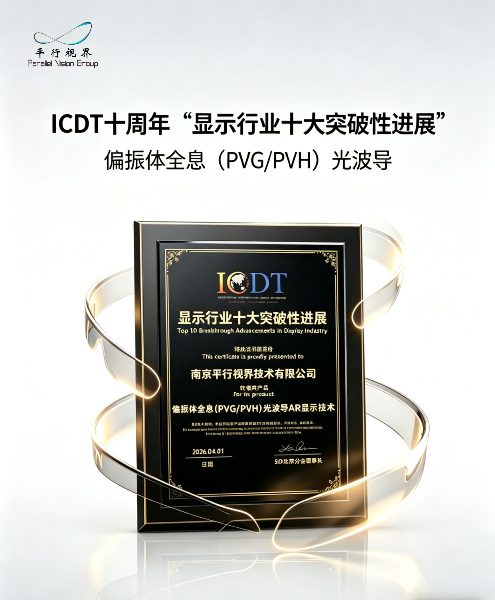 2026年4月1日,第十届国际显示技术大会(ICDT 2026)在重庆盛大启幕,大会重磅揭晓「中国显示行业十大突破性进展」获奖名单,南京平行视界技术有限公司自主原创偏振体全息(PVG/PVH)光波导AR显示技术强势入选,与京东方三折显示、TCL华星印刷OLED、海信RGB-Mini LED、维信诺VIP AMOLED等创新技术同榜获誉,彰显了平行视界PVG光波导显示的技术创新性和行业影响力;同时也体现了中国显示行业对未来新型显示形态底层技术创新的认可。