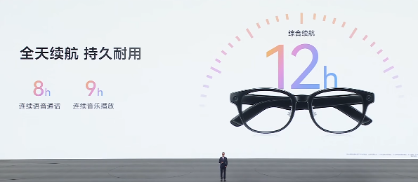通信能力上,产品采用分布式双频天线设计,对比主流AI眼镜,通话连接距离提升达61%,进一步强化稳定连接体验。续航方面,新品支持8小时连续通话、9小时音乐播放,以及最长12小时全天候综合续航,覆盖日常高频使用场景。