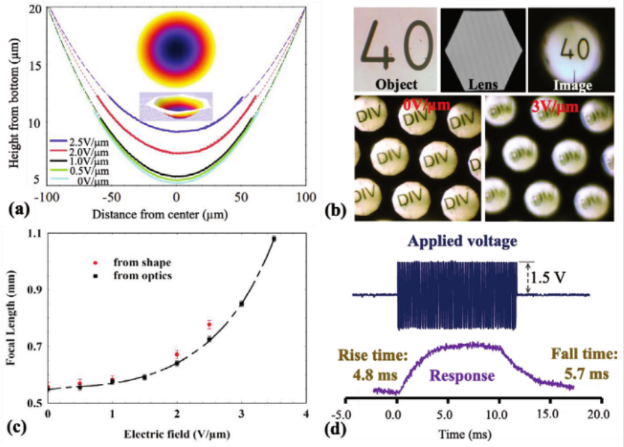 从图3(b)可以直观看到:不加电压时,透镜呈平凹形,物体"40"和"DIV"成像清晰;施加3 V/μm电场后,同一物体明显虚焦。图3(d)显示,从聚焦到散焦再恢复,全程仅约5毫秒——比人眼眨眼还快20倍。这款透镜是怎么造出来的?