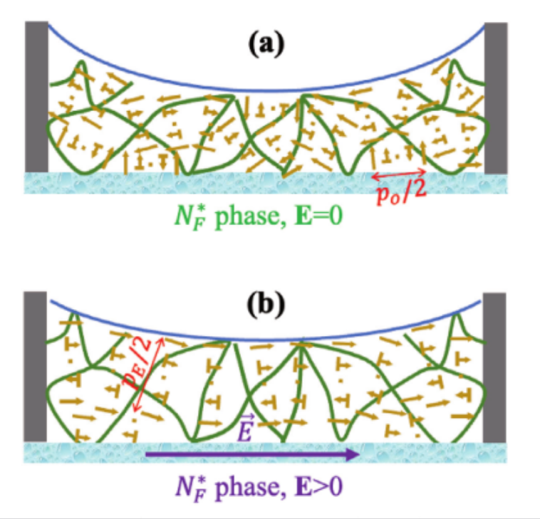 图2微透镜的纳米结构:(a)零电场下,螺旋轴随机分布,呈现光学各向同性,界面呈抛物面凹陷;(b)施加面内电场后,螺旋轴垂直于电场排列,螺距增大,曲面曲率减小,焦距随之改变