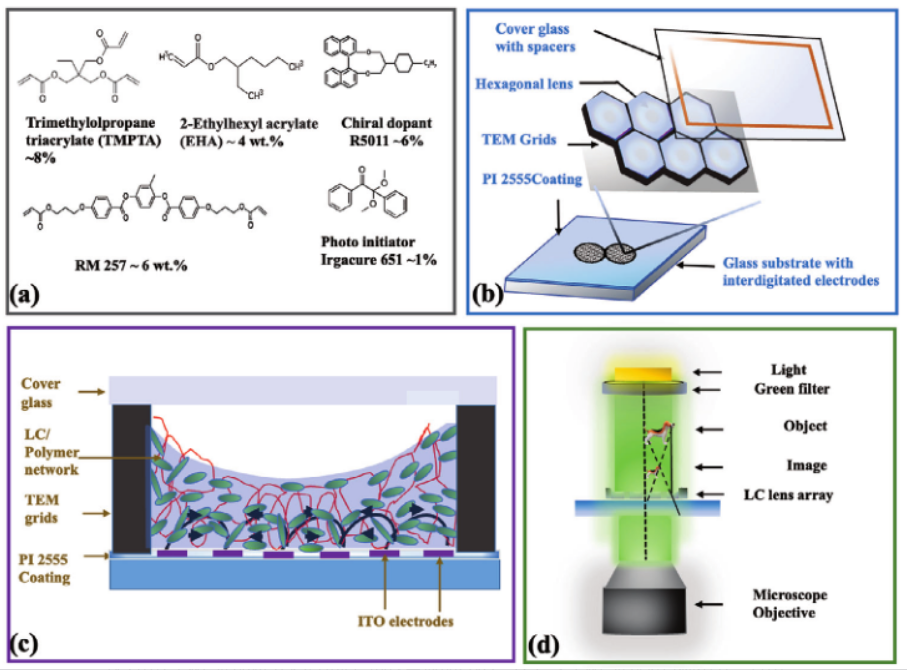图4(a)聚合物网络和前驱体的化学组成;(b)器件三维结构;(c)单个透镜单元的截面示意图,展示LC-聚合物网络和叉指电极;(d)光学测量光路图。