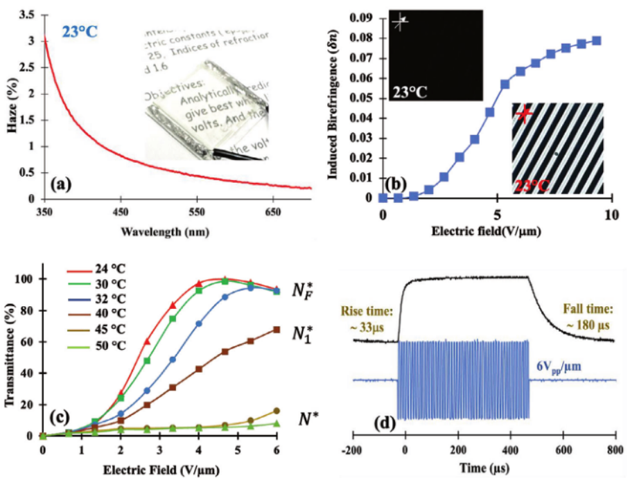 图1聚合物稳定铁电胆甾相液晶薄膜的光学性能:(a)雾度<1%(可见光区);(b)电场诱导双折射在2.5 V/μm以上才显著增加;(c)不同温度下的透过率曲线;(d)开关响应时间仅为33微秒(上升)和180微秒(下降)。
