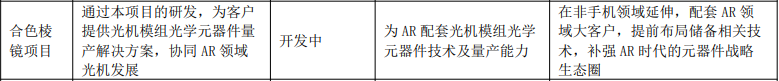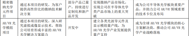 报告期内,AR 光学业务聚焦核心技术与工艺突破,以及大规模、高质量、高度自动化的量产能力建设,战略卡位优势持续夯实。公司将反射光波导作为“一号工程”重点推进,核心工艺持续优化迭代,成功打通多个关键工艺节点,完成初步量产试制线搭建,为技术产业化落地奠定坚实的基础;衍射光波导业务,公司持续深化与行业头部企业合作,升级核心产线,并积极拓展终端大客户;同时,公司持续完善光机及核心光学元器件等产品的研发布局,完善公司在AR光学的产品矩阵和生态。