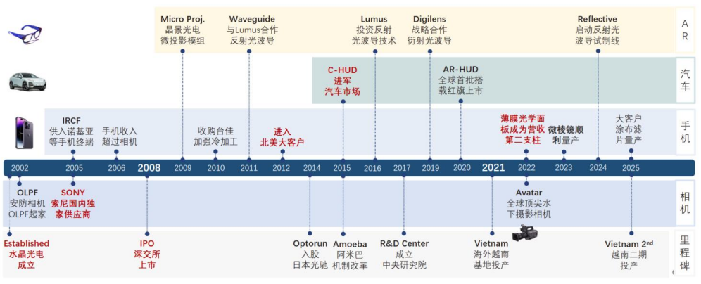 公司深耕 AR 眼镜可穿戴设备领域,布局十余年,与终端品牌紧密合作,配合终端客户开发,负责整个硬件光学系统落地,致力于成为全球 AR 光学显示解决方案的龙头企业。
